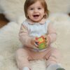 التصميم: جاكيت بياقة دائرية وأزرار أمامية لسهولة الارتداء، مزين بجيوب أمامية مطرزة برسومات “بطة وزهور” مبهجة.