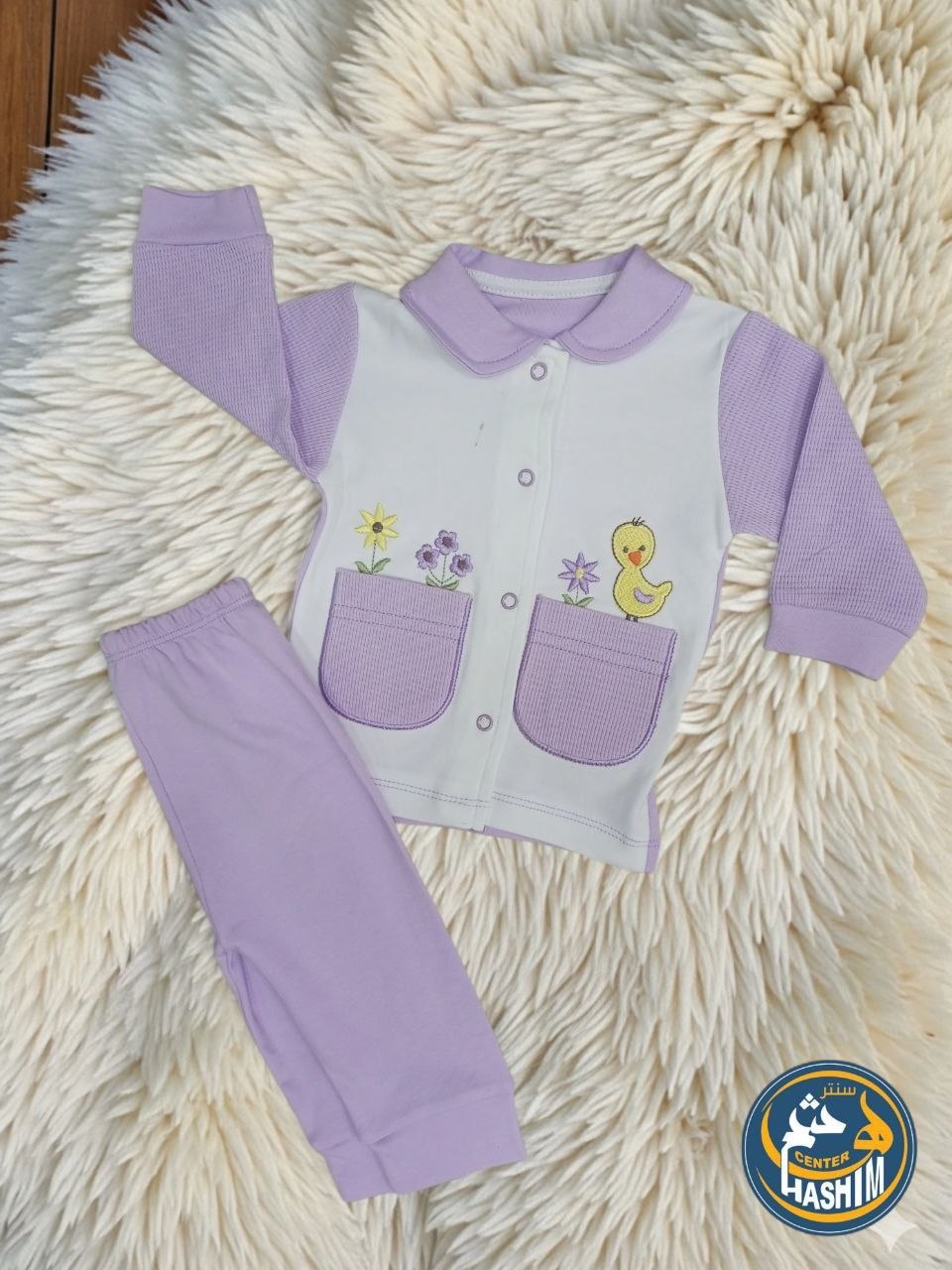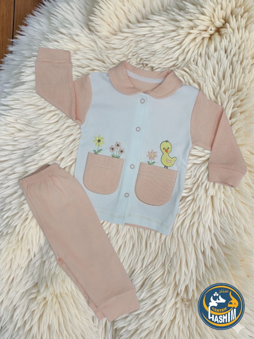 التصميم: جاكيت بياقة دائرية وأزرار أمامية لسهولة الارتداء، مزين بجيوب أمامية مطرزة برسومات “بطة وزهور” مبهجة.