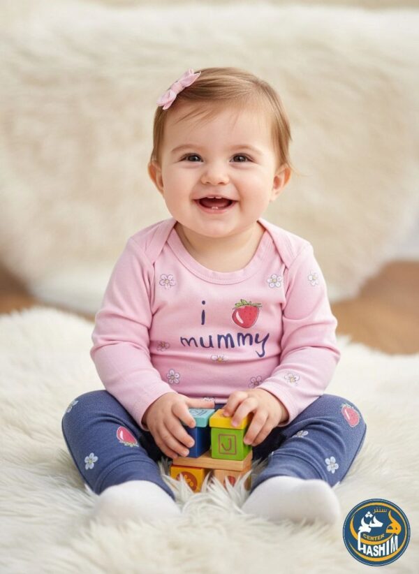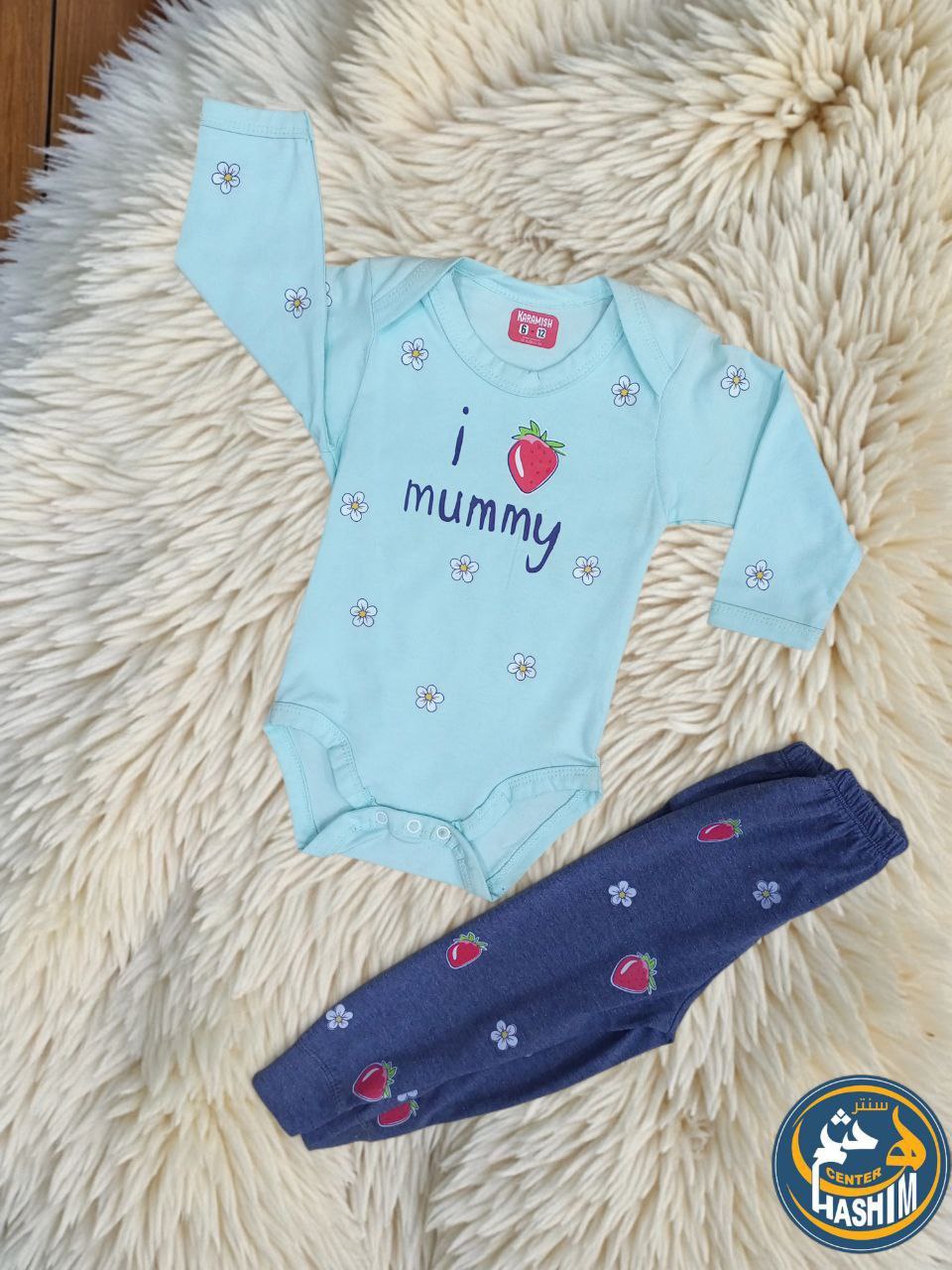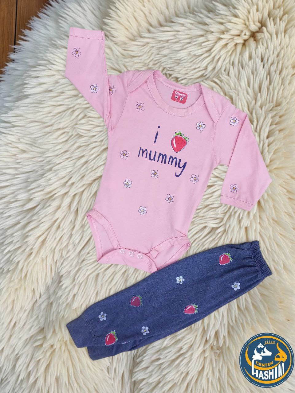 تصميم مبهج: طقم مكون من قطعتين مزين بنقشة الفراولة اللطيفة مع عبارة “I ❤️ mummy” المحببة.