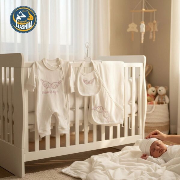 التصميم: طقم عصري يتكون من 3 قطع (سالبوت، مريلة، وغطاء رأس) بتطريز أنيق بلمسة “البيوتي آنجل”.