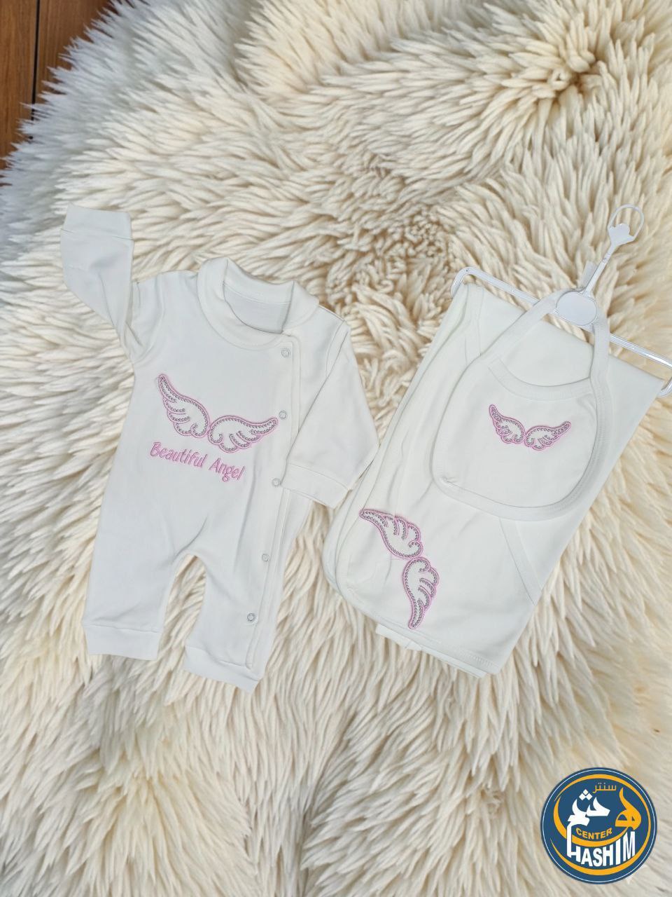 امنحي طفلك الدفء والنعومة الفائقة مع طقم الشتاء الفاخر من تشكيلتنا الجديدة. يتميز الطقم بتصميمه الراقي المزين بأجنحة الملائكة الرقيقة، ليجمع بين المظهر الأنيق والراحة المثالية لبشرة طفلك الحساسة.