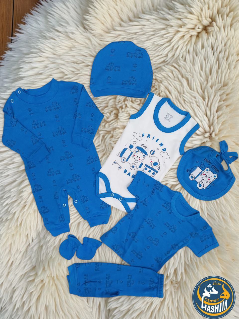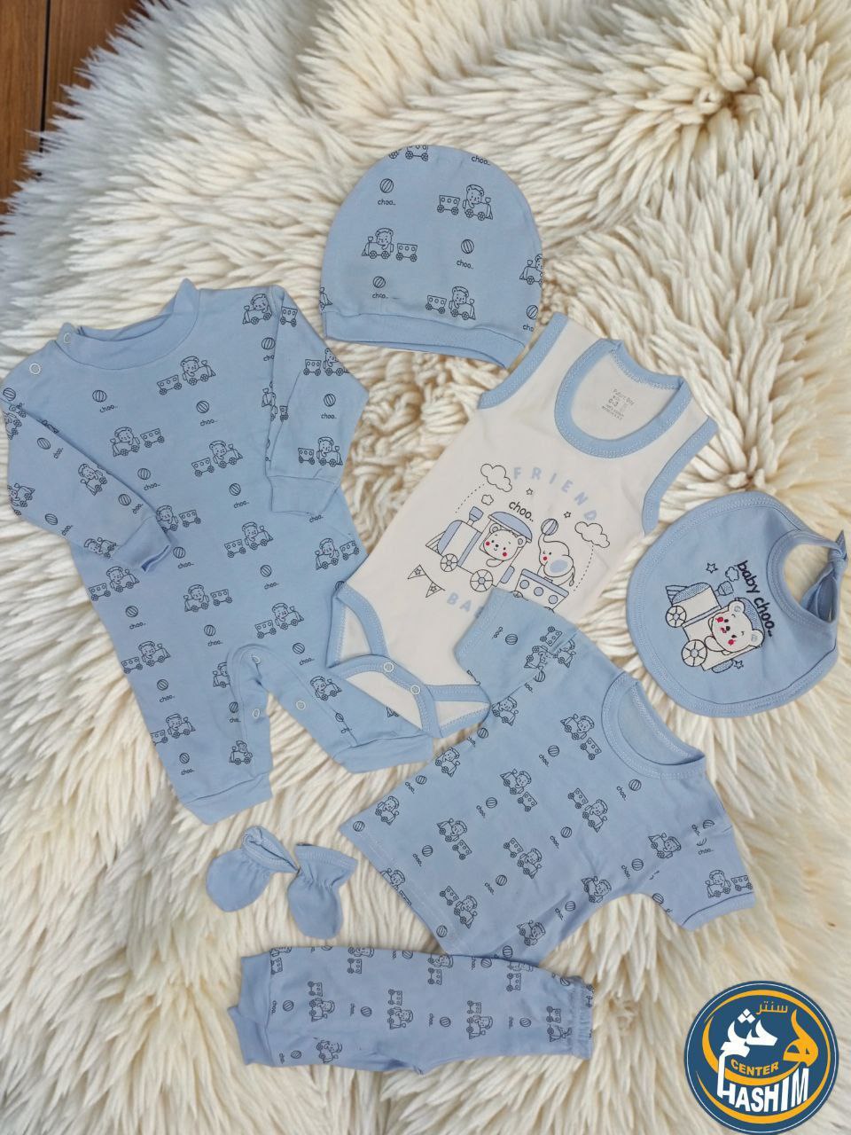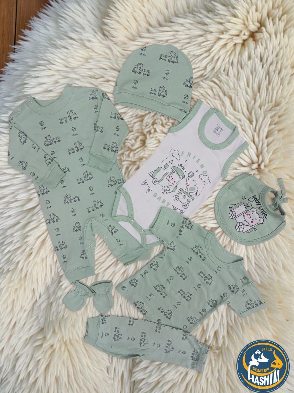 استقبلي طفلك بأناقة وراحة تامة مع هذا الطقم المتكامل المكون من 7 قطع متناسقة. يتميز التصميم بنقشات هادئة لـ “دبدوب وعربة قطار” تضفي لمسة من البراءة والجمال على إطلالة طفلك الأولى.