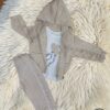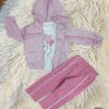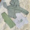 التصميم: طقم كاجوال يتألف من جاكيت بقلنسوة، تيشرت داخلي مزين برسومات رقيقة، وبنطلون مريح بتصميم عصري.