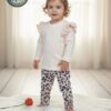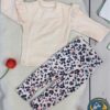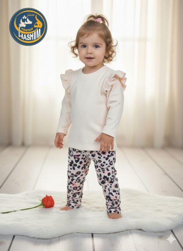 مميزات البنطال: بنطال عصري ومريح يتميز بنقوش شبيهة بجلد الحيوانات (Animal Print) باللونين الأبيض والأسود/الداكن، مع لمسات وردية رقيقة، مما يضيف حيوية مميزة ويضمن سهولة الحركة واللعب.