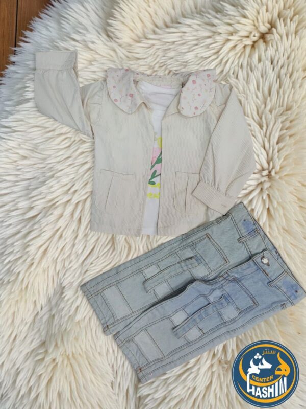 تصميم ثلاثي فريد: يشمل جاكيت بياقة مزينة بنقشات الورد، تيشيرت ناعم، وبنطلون عصري مريح.