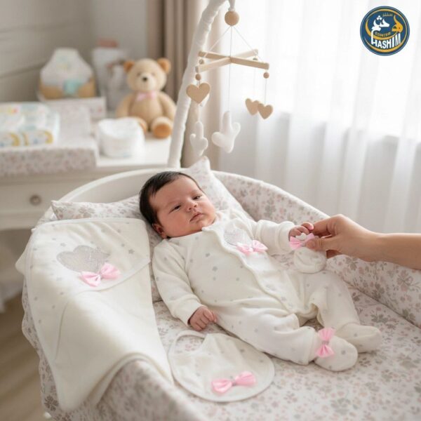 دللي طفلتك بإطلالة ساحرة مع طقم الاستقبال القطني الفاخر، المصمم بعناية فائقة ليجمع بين الأناقة والراحة المطلقة في أولى أيامها.