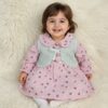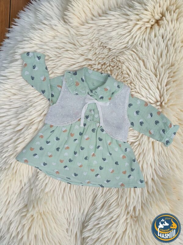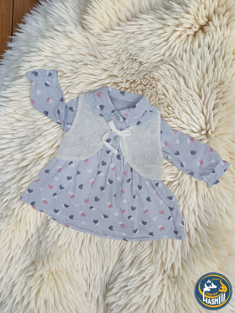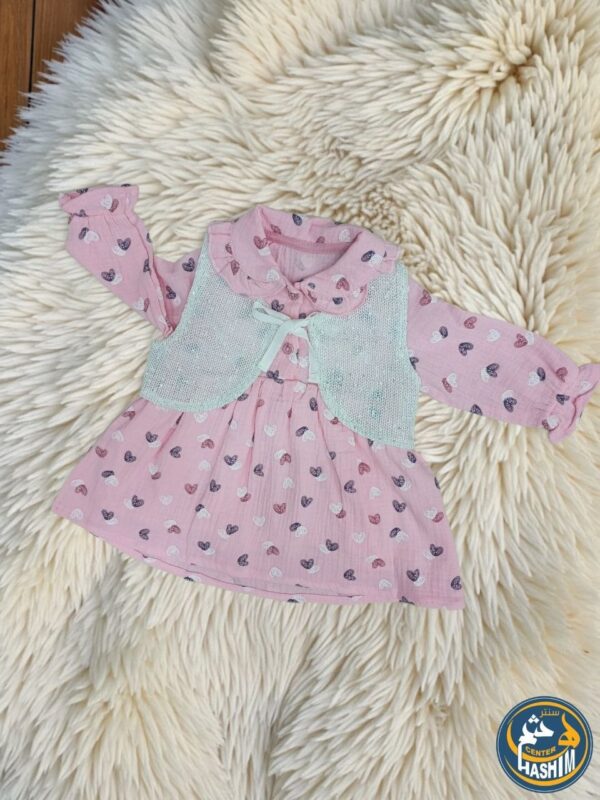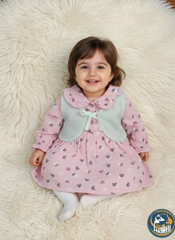 امنحي طفلتك إطلالة مريحة ومليئة بالبهجة مع هذا الفستان القطني الرقيق. يتميز التصميم بنقشات القلوب الصغيرة التي تضفي حيوية، مع بوليرو (جاكيت قصير) بدون أكمام يكمل أناقة الطقم ويجعله مثالياً للنزهات والمناسبات العائلية.